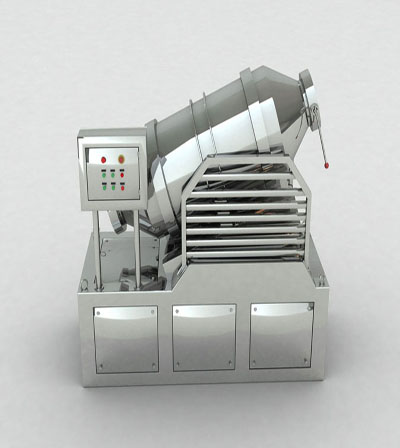 二維混合機,全稱二維運動混合機,顧名思義,是指轉筒可同時進行二個方向運動的混合機。二個運動方向分別是轉筒的轉動,轉筒隨擺動架的擺動。被混和物料在轉筒內隨轉筒轉動、翻轉、混和的同時又隨轉筒的擺動而發生左右來回的摻混運動,